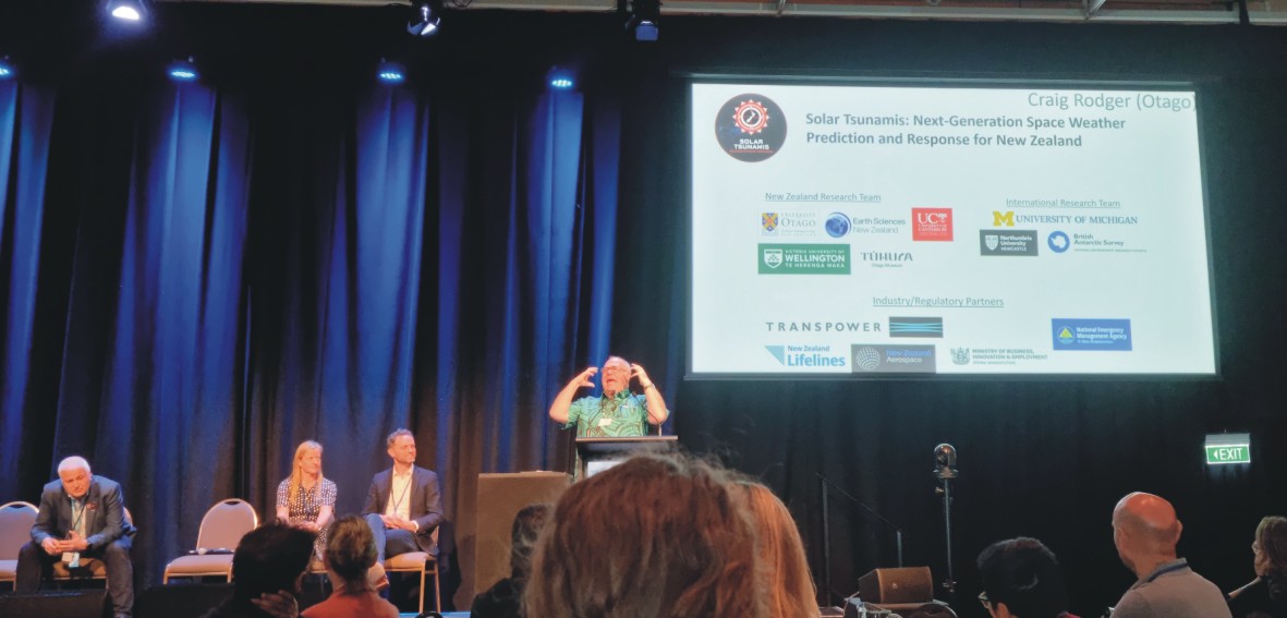 | Craig speaks at the 2024 National Lifeline Utilities Forum held in the Christchurch Convention Centre from 17-18 October 2024. Craig and an MBIE collaborator, Fiona Dally, spoke on Space Weather in the New Zealand context. The forum included participants from a wide range of government and industry representatives and beyond (image courtesy of NEMA staff, taken on 17 October 2024). | ![]() |